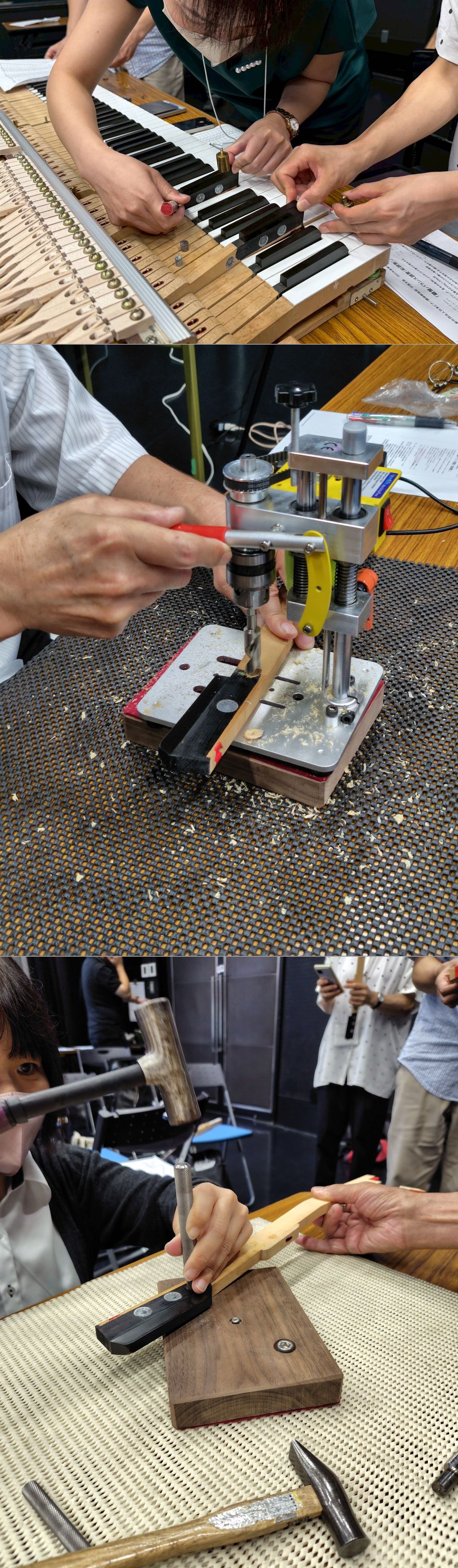 鍵盤バランス調整(鉛調整)日時:2025年8月26日(火)10:00~16:00会場:広島市東区民文化センター スタジオⅡ講師:土屋正方(関西支部)参加者:27名この度の研修会は鍵盤の加工を伴う研修会でした。お客様からの要望でタッチの調整をされていると思いますが、鉛調整を経験することによって自身の調整の幅が広がります。参加者各自が白鍵と黒鍵を一本づつ鍵盤の重さをグラムウエイトで確認、既定の重さになるように鉛の位置を決めて穴あけし、鉛の打ち込みを行いました。広報/田口