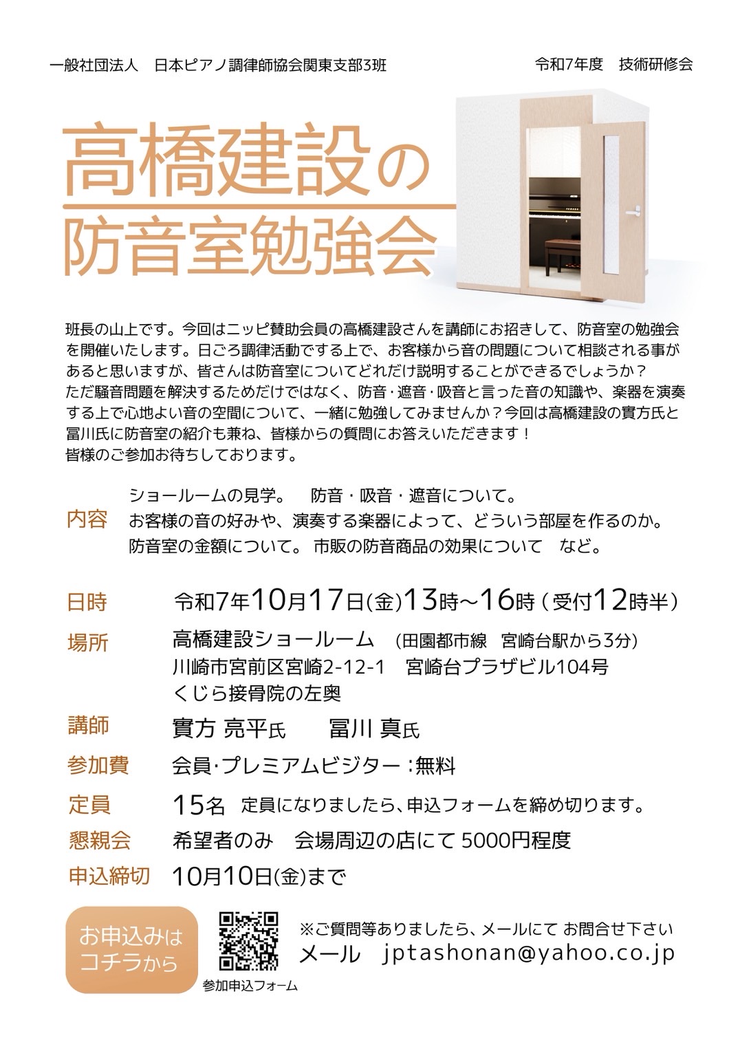 今回3班では賛助会員の高橋建設さんを講師にお招きして、防音室の勉強会を開催いたします。高温・遮音・吸音といった音の知識や、楽器を演奏する上で心地良い音の空間について皆さんと勉強してみたいと思います。
