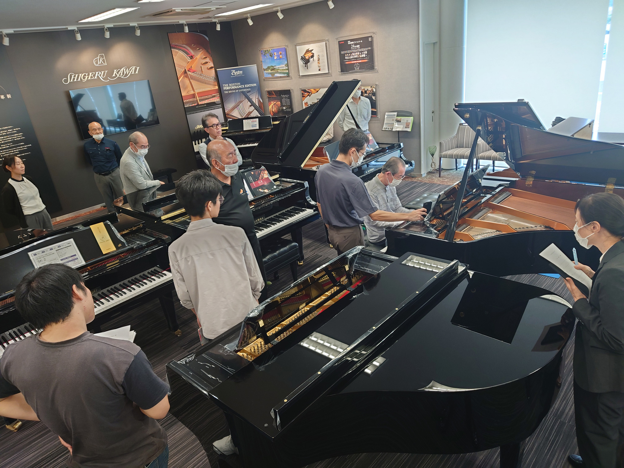 まず始めに、ヤマハC3・カワイSK・カワイGX・ボストンGP・カワイUPを並べ、メーカー、器種、個体、調律法(古典調律)、ピッチの異なるピアノを参加者1人ずつ触ってもらい違いを感じて用紙に記入して頂きました。
