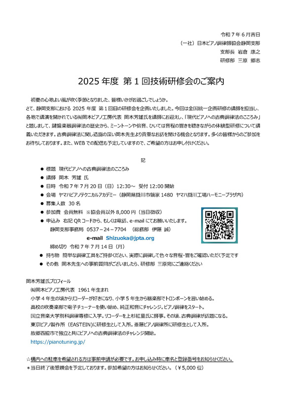 「現代ピアノへの古典調律法のこころみ」と題しまして、(有)岡本ピアノ工房代表 岡本芳雄氏をお迎えし講義していただきます。