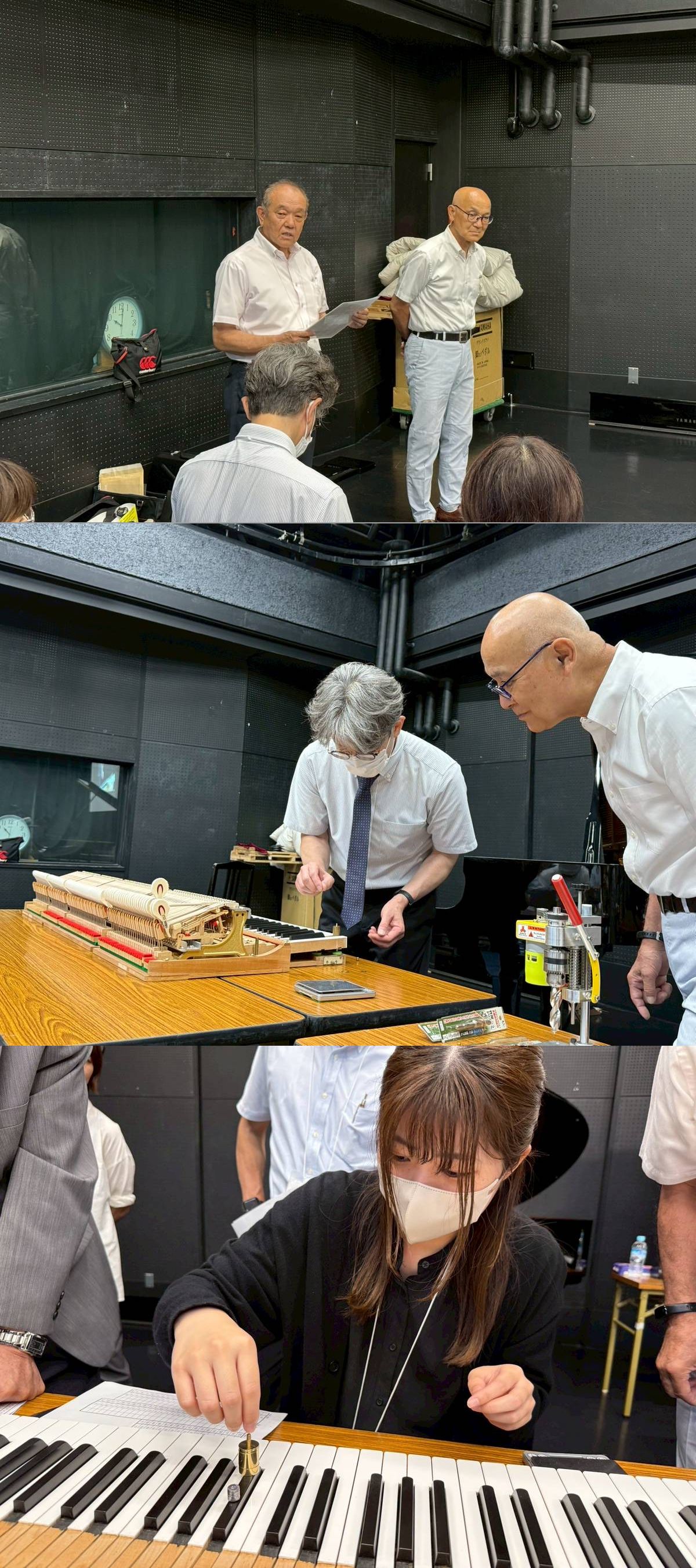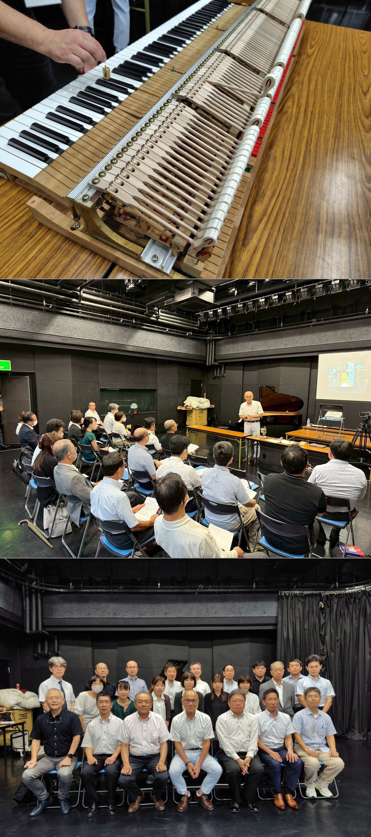 鍵盤バランス調整(鉛調整)日時:2025年8月26日(火)10:00~16:00会場:広島市東区民文化センター スタジオⅡ講師:土屋正方(関西支部)参加者:27名この度の研修会は鍵盤の加工を伴う研修会でした。お客様からの要望でタッチの調整をされていると思いますが、鉛調整を経験することによって自身の調整の幅が広がります。参加者各自が白鍵と黒鍵を一本づつ鍵盤の重さをグラムウエイトで確認、既定の重さになるように鉛の位置を決めて穴あけし、鉛の打ち込みを行いました。広報/田口