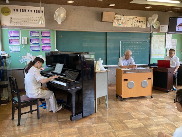90分授業で、前半はピアノの歴史や構造の講義と調律体験、後半はDVD鑑賞と坂口先生のコンサート、という構成です。