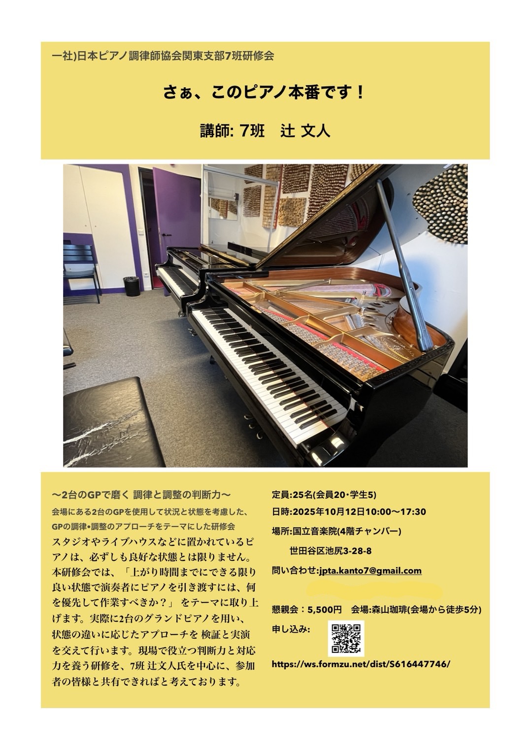 本研修会では、「上がり時間までにできる限り良い状態で演奏者にピアノを引き渡すには、何を優先して作業すべきか?」をテーマに取り上げます。実際に2台のグランドピアノを用い、状態の違いに応じたアプローチを検証と実演を交えて行います。現場で役立つ判断力と対応力を養う研修を、7班辻文人氏を中心に、参加者の皆様と共有できればと考えております。