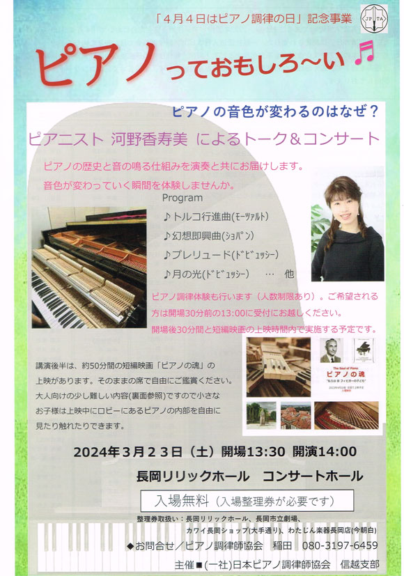 トーク&コンサートやピアノの内部を見たり触れたり、ピアノ調律体験も出来たりします(^^♪