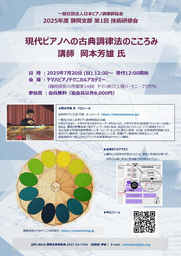 「現代ピアノへの古典調律法のこころみ」と題しまして、(有)岡本ピアノ工房代表 岡本芳雄氏をお迎えし講義していただきます。